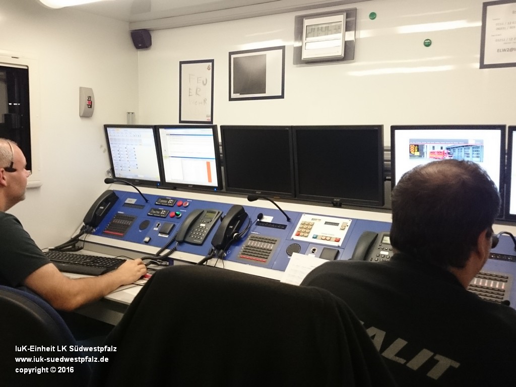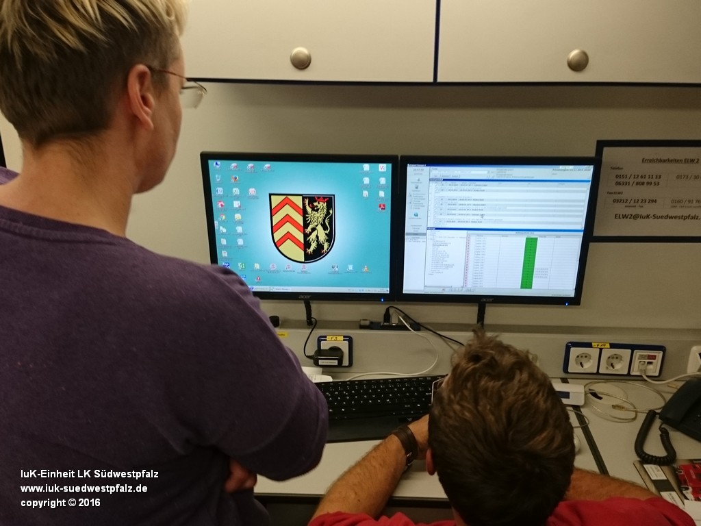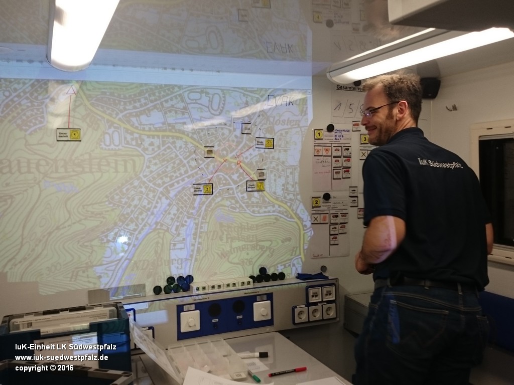 Hierfür wurde in Hauenstein ein Verkehrsunfall mit einem Gefahrguttransporter und einem darauffolgenden Massenanfall von Verletzten (kurz: MANV) angenommen. Nach der gedachten Ankunft des EInsatzleitwagens 2 an der EInsatzstelle übernahm dieser die Kommunikation der am Einsatzort gebildeten Einsatzabschnitte. Für den Einsatzleiter und die ggf. eingesetzte Technische Einsatzleitung (TEL) ist es bei Großschadenslagen unersetzlich, einen visuellen Überblick über die eingesetzten Kräfte zu haben. Die Lagedarstellung wird im Einsatzleiwagen 2 mithilfe eines Beamers und verschiedenen Kartenprogrammen angewendet. Unterschiedlichste Piktogramme und Zeichen verdeutlichen unterschiedliche Organisationseinheiten und Fahrzeuge und können über ein Magnetsystem beliebig an der Wand des Besprechungsraumes dargestellt werden.