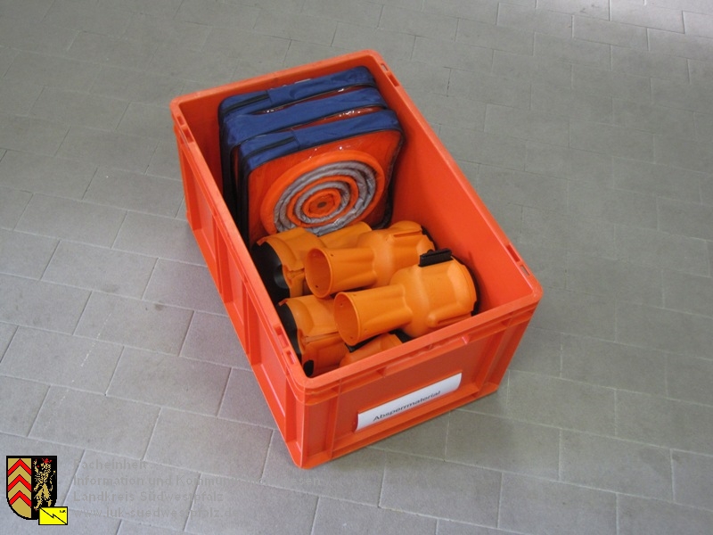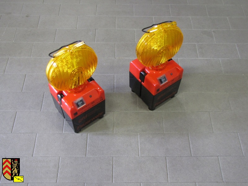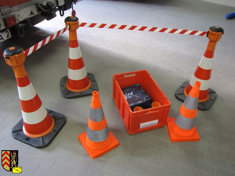 Verlastet auf dem Einsatzleitwagen 2 befindet sich das Absperrsystem, bestehent aus folgenden Komponenten: - 3x Faltkegel (mit Leuchte) - 5x Verkehrsleitkegel - 5x Skipper für Verkehrsleitkegeln - 2x Blitzlampen Das Sytem wird eingesetzt um den ELW2 an Einsatzstellen abzusichern und nur befugten Personen Zutritt zu gewähren.